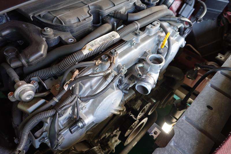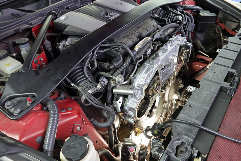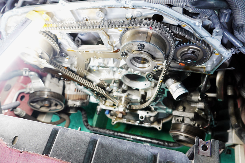VR37エンジンはR35GT-Rのエンジンと同じです。ウオーターポンプを交換するにはタイミングチエーンカバーを分解の必要があります。