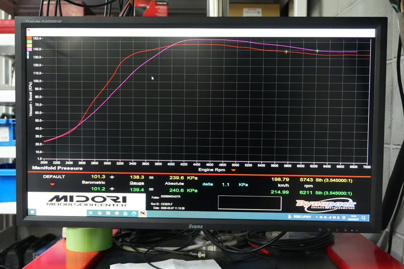 エンジンを2.8L仕様にチューニングしてから約1年が経過しました。十分な慣らしが終わったので仕上げのECUセッティング調整を行います。純正ECUは取り外してHKS製F-Con V-Pro3.4とクランク角センサーキットを採用しています。クラセンキットにする事で始動性に優れ、高回転までクランク信号がタイミングベルトの影響を受けないのでパワーも大幅に向上します。加給圧は1.60kpaを希望していましたが触媒が付いている状態では1.50kpaが常用可能な加給圧と判断しました。
