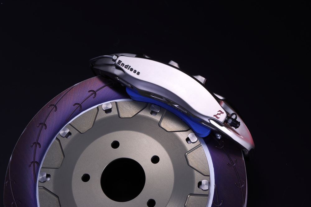 新たにエンドレス社と共同開発した鍛造モノプロックキャリパーキットです。競技レベルの走行まで想定した高剛性の鍛造モノブロックキャリパーは、卓越した制動性能、鯛久性はもちろん、コントロール性の高いペダルタッチを実現しました。クローム仕上げのキャリパー表面には「GT-R」と「ENDLESS」のロゴを刻印。裏面には「MIDORI」のロゴを刻印しました。